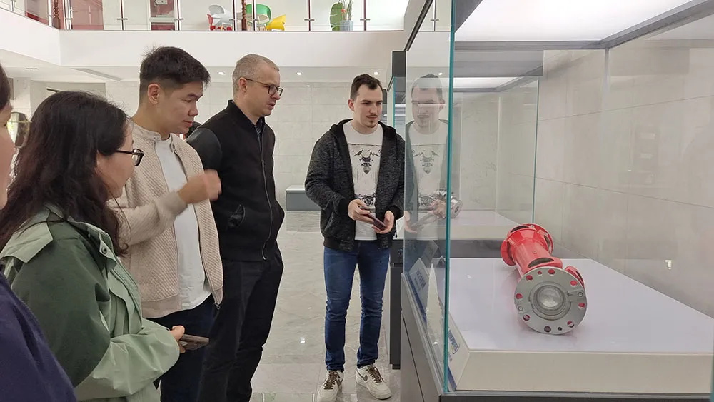 When they came to our exhibition hall, the Russian guest introduced the products on the lifting equipments to his guest.