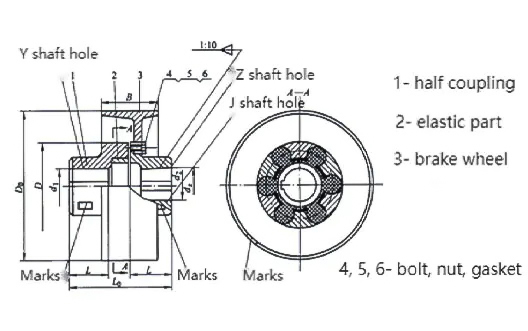 Basic components: Active / Passive half coupling with protruding claws,plum-shaped elastic element (polyurethane / cast nylon), braking wheel (LMZ - I split assembly, MCL - II integrated with the half coupling), bolts, nuts, positioning pieces, etc.